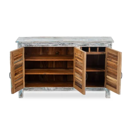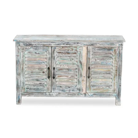 Mango Wood Hand Carved 3 Door Side Board White Distress Finish