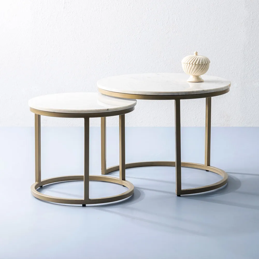 Embrace Timeless Elegance with Our Clear White Iron Base Brass Type Coated Round Marble Side Table